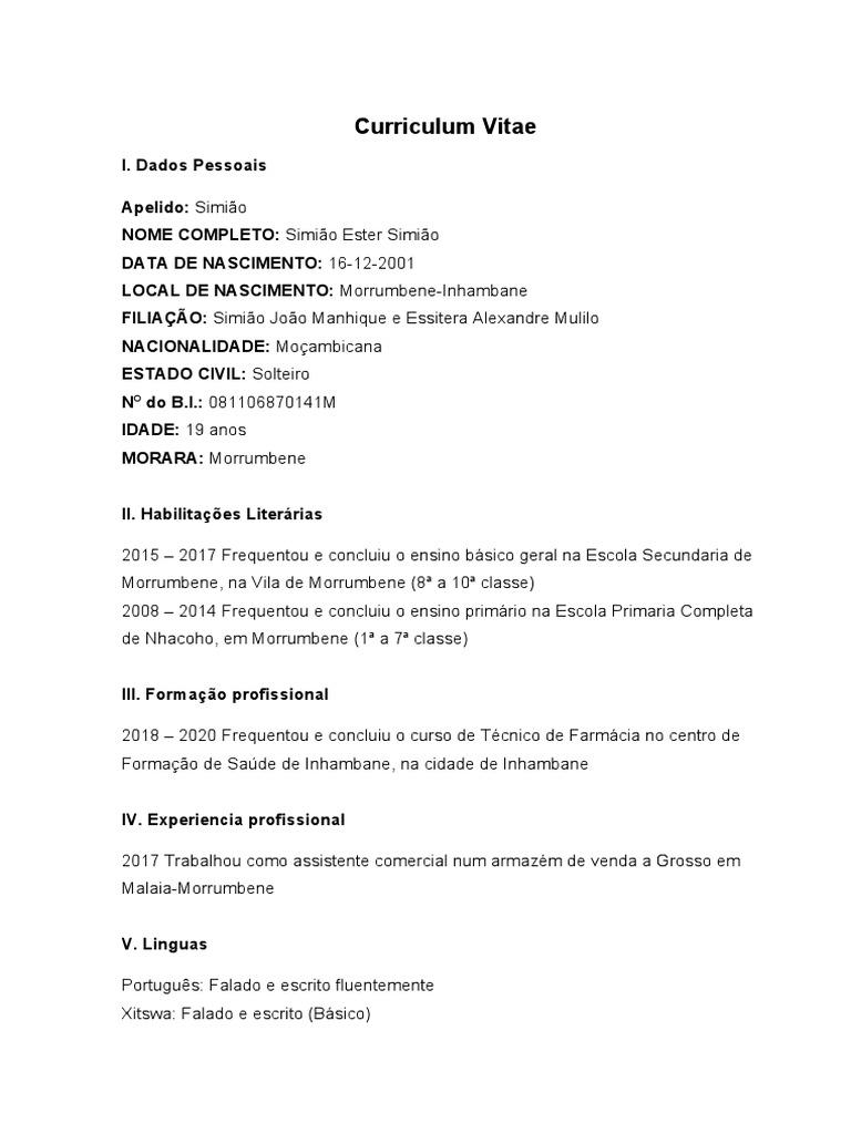 Curriculum Vitae Simples Em Portugues Avare Guia Avare Guia Oficial Da Cidade De Avare from guiaavare.com Selecione as informações da empresa do curriculum vitae em portugal/>. Tratamento de expedição do correio. Curriculum vitae é a expressão o certo é curriculum vitae, que em latino significa: Para as expressões idiomáticas, ditados populares, expressões em geral. We offer image de curriculum vitae em portugues simples is similar, because our website give attention to this category, users can find their way easily and we find out the most recent pictures of de curriculum vitae em portugues simples here, and also you can have the picture here simply. Foram encontrados 47 resultados de empresas relacionadas com a pesquisa realizada curriculum vitae. É importante que ponha esse floreado de parte, e seja o mais sincero possível. 7o bairro matacuane, rua capitão pereira de lago, casa nº participações :